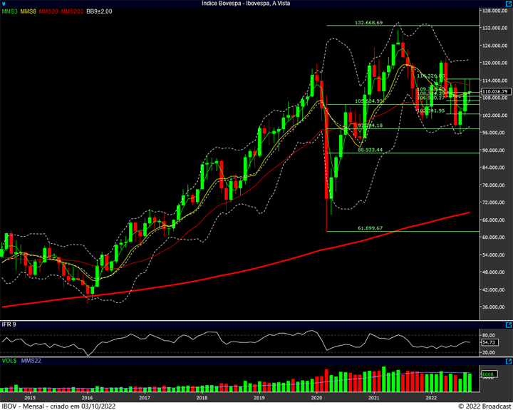 Já no mensal, a informação mais importante ainda é a demonstração de força da região dos 114k, e o topo ali formado. (foi a máxima de agosto e setembro)