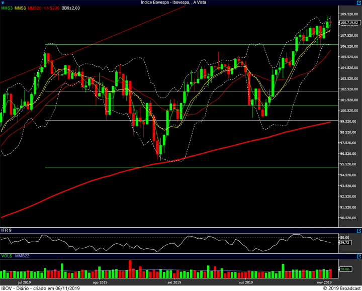 Isso só reforçou os dois pontos que acabei de cita: suporte nos 108.200 e resistência nos 109k. O rompimento de uma das marcas pode trazer um movimento um pouco maior para a direção rompida. 😉