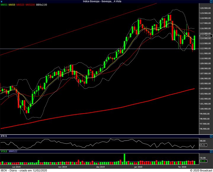 Neste momento, o suporte (forte) está na região dos 112k, enquanto a resistência nos 117.700 pontos.
