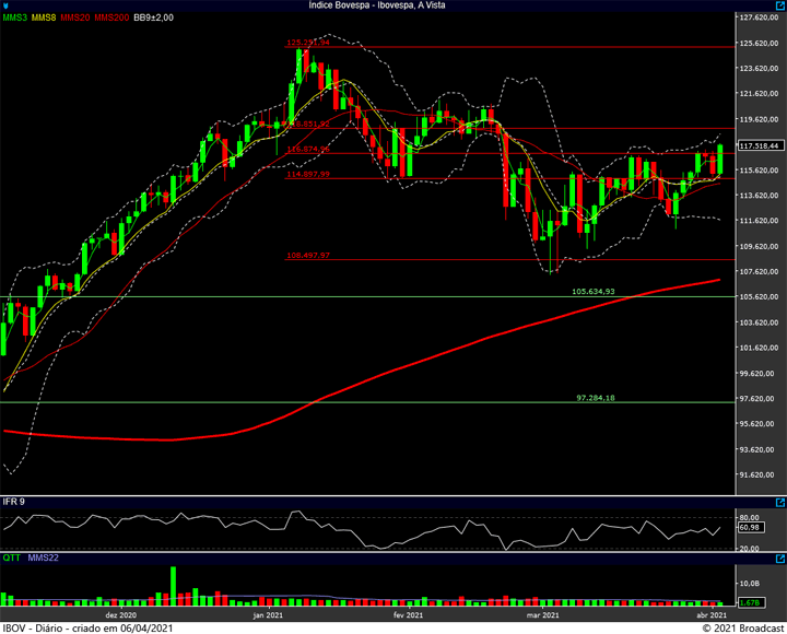 Para hoje, observação da região dos 117.500 pontos, com suporte nos 115k e resistência nos 121k.