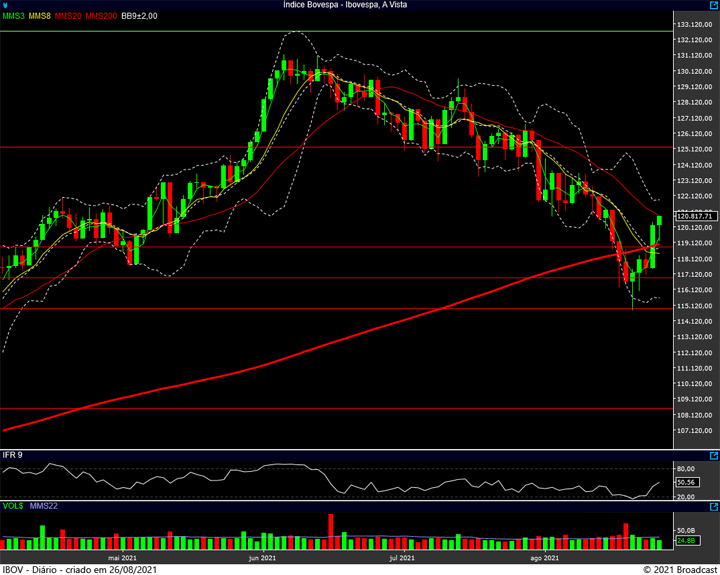 Então, hoje temos o suporte na região dos 119.500 pontos, com a resistência nos 121k. E estes serão nossos “guias” para hoje.