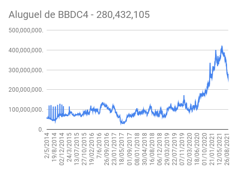 Este é um dado que acompanho diariamente, serve para que eu veja o “peso” extra que existe sobre estas ações. Normalmente – veja bem, normalmente … – um aumento na posição alugada pode significar um movimento de queda no papel. E o contrário também é verdadeiro, uma cobertura pode significar um movimento de alta.