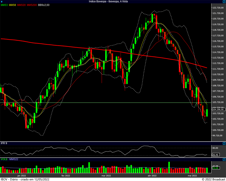 Portanto, mantenho o acompanhamento nos mesmos números de ontem: suporte no 102.386 e resistência no 104.286 pontos.