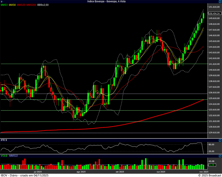 E continuamos subindo. O ponto mais importante de todos os tempos da última semana, ao menos por hoje, fica no 149.500 pontos. Enquanto isso, o suporte permanece no 140 mil. Resistência ? Não existe … (ao menos visível, “física”)