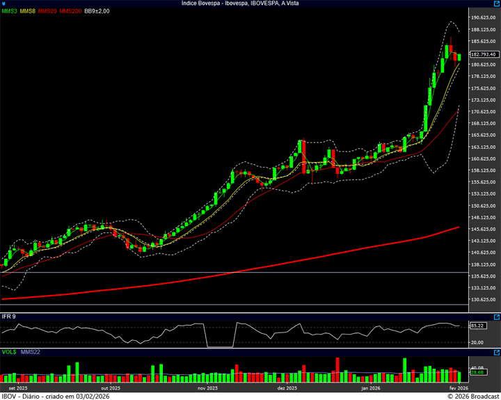 Resistência no 186.500 pontos, suporte no 180 mil.