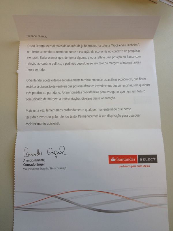 Isso é justamente o que eles querem que a maioria pense … Afinal de contas somente clientes Santander Select, um pequeno grupo dentro do universo de clientes do banco, receberam tal texto. Bem … receberam naquele momento, pois hoje toda e qualquer pessoa tem acesso ao mesmo. A notícia mais do que se espalhou e uma cópia do material pode ser encontrada em “qualquer esquina”.