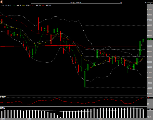 Veja que na sexta-feira rompemos duas importantes marcas/resistências: a cabeça do pivot de alta e a média de 200 dias. Não me surpreenderia ao ver uma correção que viesse testar, por cima, estas mesmas regiões … Mas a “pressão” é tanta, que não duvido nada de ver um teste direto lá nos 60k. (não seria o normal, mas … vai saber)