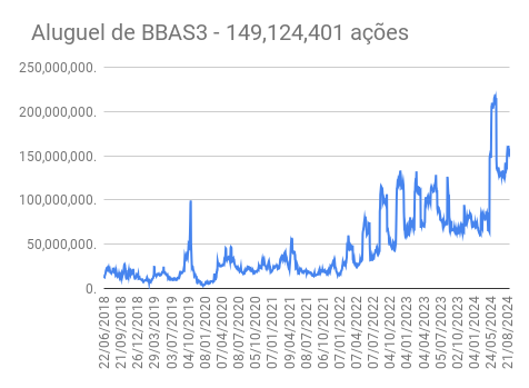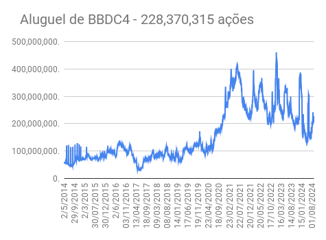 Este é um dado que acompanho diariamente, serve para que eu veja o “peso” extra que existe sobre estas ações. Normalmente – veja bem, normalmente … – um aumento na posição alugada pode significar um movimento de queda no papel. E o contrário também é verdadeiro, uma cobertura pode significar um movimento de alta.