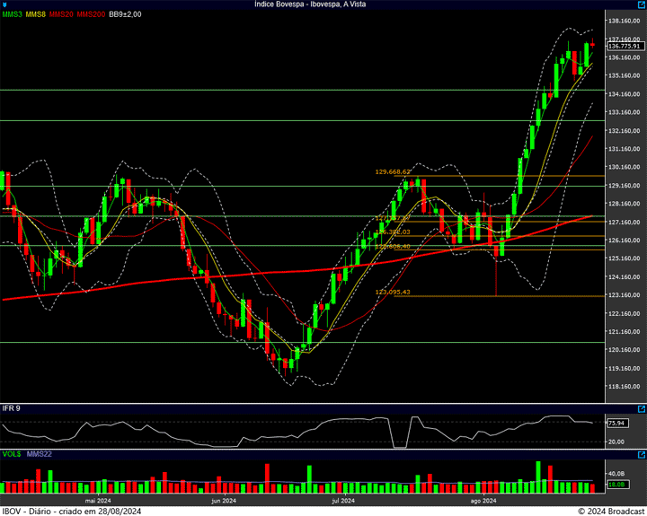 Neste momento a região dos 137 mil pontos vai se mostrando forte, é a resistência da vez. O índice vem tendo dificuldades para supera-la …