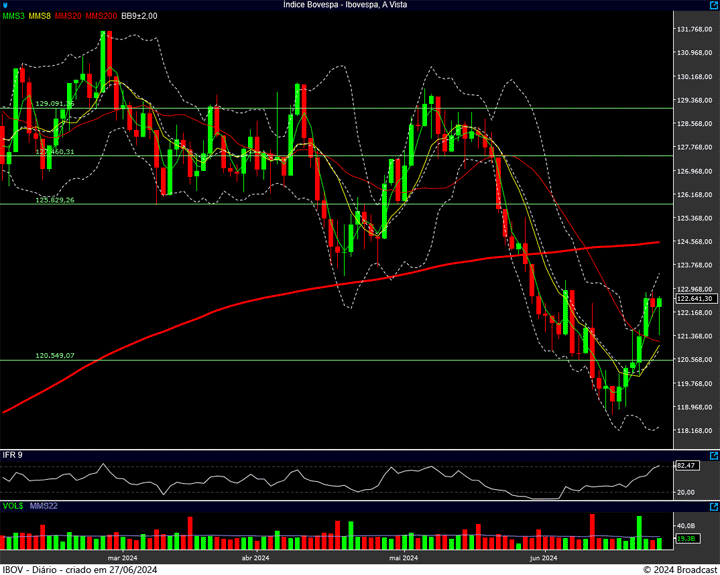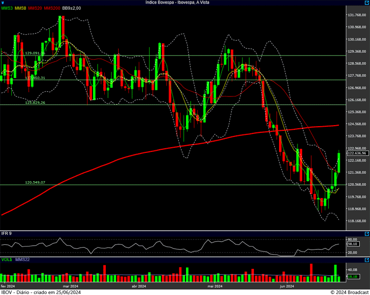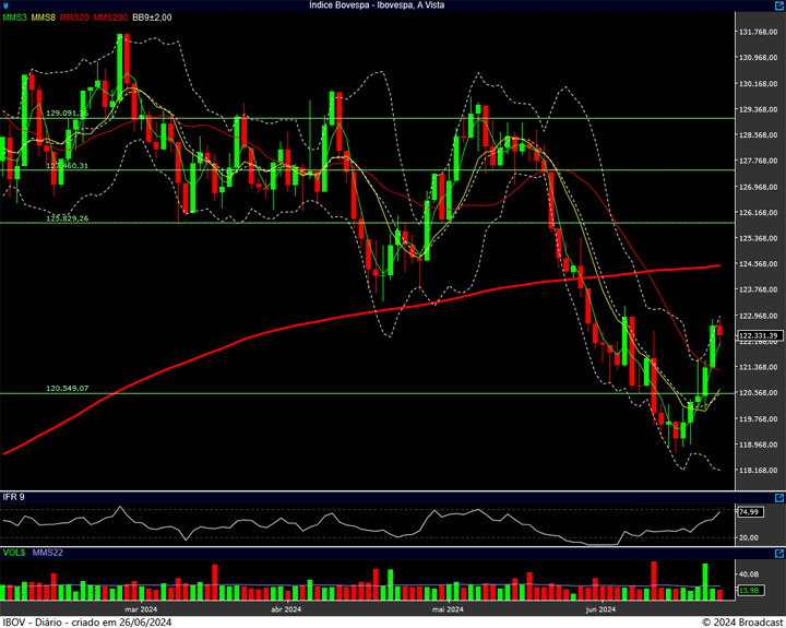 Pois então: suporte nos 122k, resistência nos 122.850 pontos. E segue o jogo.