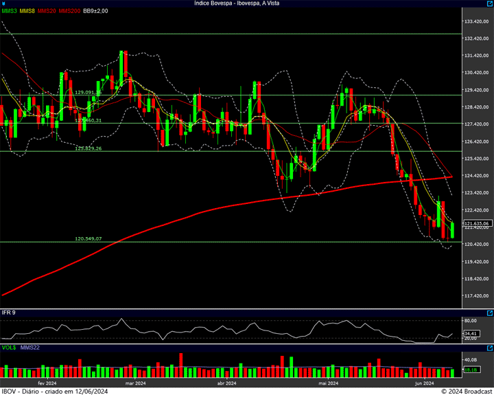Pontos de observação para hoje: 121.500 pontos, é a zona de guerra. Suporte no 120.500 pontos, resistência no 123.250 pontos. Depois a gente vê outros números, mas agora são estes os que nos importam.