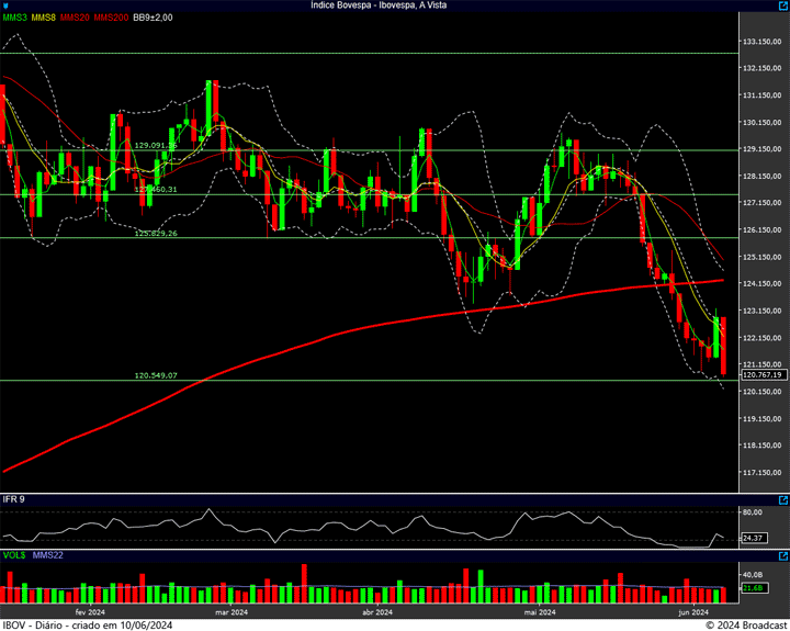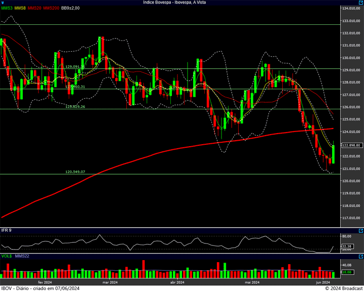 Já a resistência está nos 123.250 pontos, com uma próxima nos 125.400 pontos. A dos 130k nem precisaria ser citada neste momento específico.