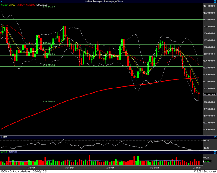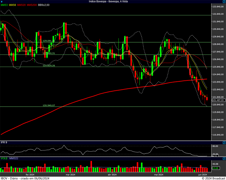 Suporte no 120.850 – reforçado pelo 120.500 pontos – e Resistência nos 125.400 pontos, com apoio “distante” dos 130 mil.