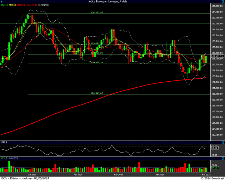 Hoje, os pontos de observação são: 125.850 pontos, suporte, e 127.350 pontos, a resistência.