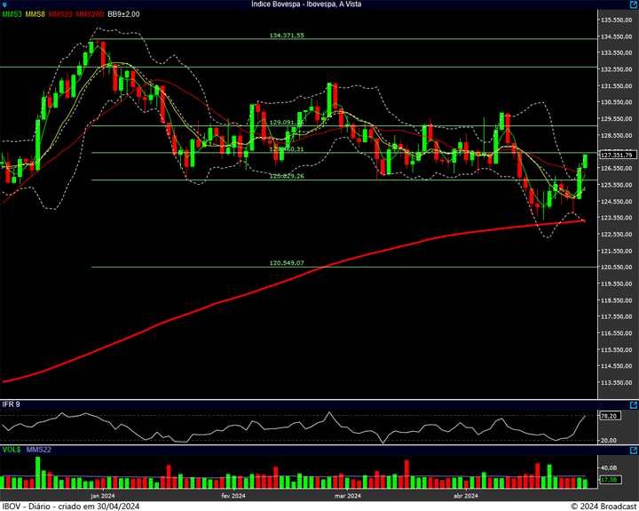 Se você olhar para o intraday, no 60 minutos, verá que a coisa não está tãããão legal assim. Esticado. Pode rolar uma pausa pro xixi ainda hoje. E com isso, o 126.500 pontos é a região mais importante de todos os tempos da última semana, ao menos por hoje, pra mim.
