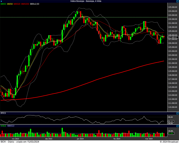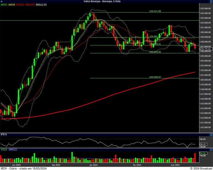 Se conseguir, teremos a região dos 128.500 pontos atuando como resistência. Em seguida, somente o 131.700 pontos aparece na tela.