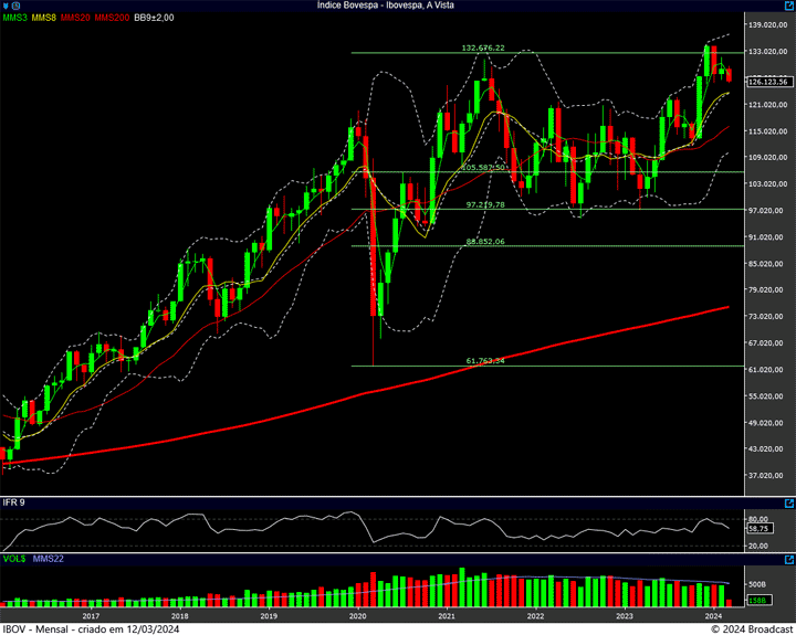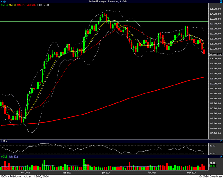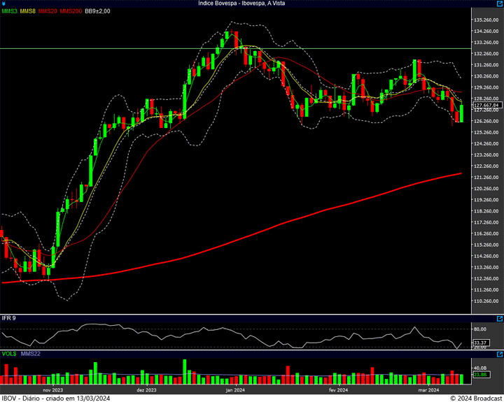 Mantemos a região dos 125 mil pontos no foco. É ali que está a última trincheira de defesa dos Touros. É o suporte da vez. A resistência, você já sabe que está nos 131.700 pontos. Talvez a região dos 129.400 pontos possa apresentar alguma força … (caso venha a ser testada)