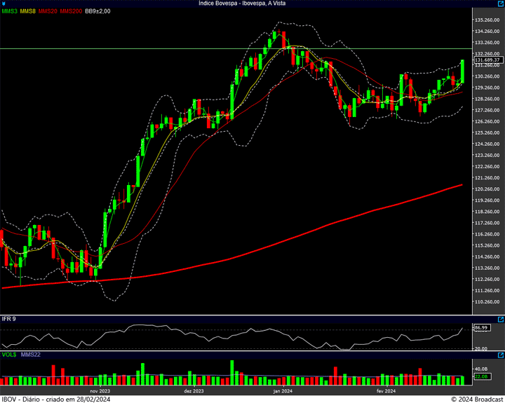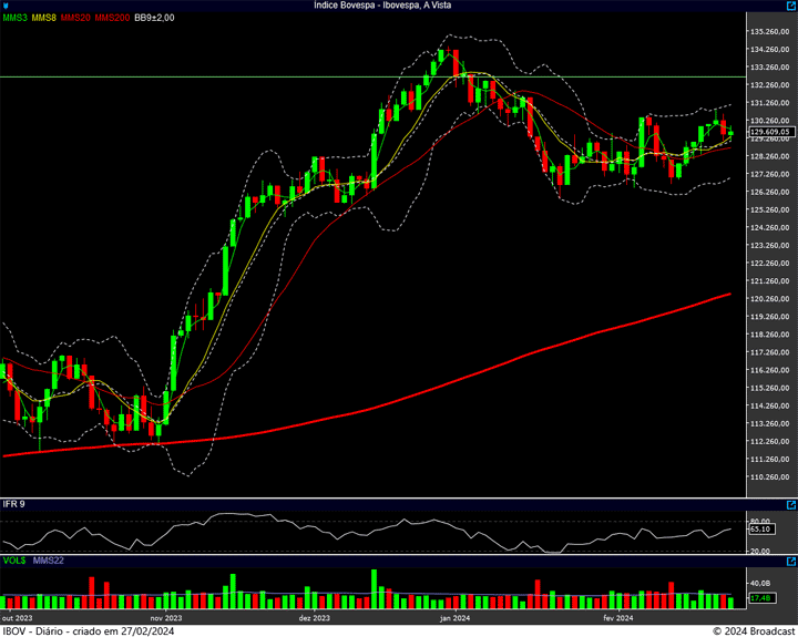 Neste momento, atualização dos números: suporte nos 129 mil, resistência nos 134.400 pontos.