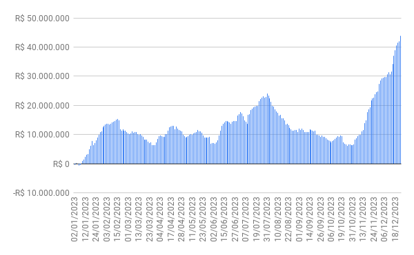 Estamos vivenciando uma arrancada daquelas. Mais de 20% em apenas 2 meses. 101% bancada pelos gringos. (novembro e dezembro, juntos, foram os meses onde mais vi dinheiro gringo vindo para a Bolsa nestes 20 e tantos anos em que acompanho o Mercado)