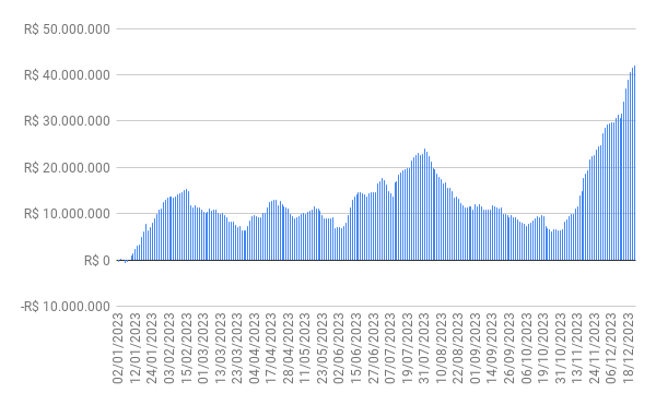 E como já disse outro dia, se você quiser mesmo encontrar um “culpado” por estarmos aqui, culpe os gringos. Com a injeção de R$42 bilhões em apenas 2 meses (movimento surreal, que nunca vi igual), eles fizeram com que o índice subisse 20% no período. Coisa de doido …
