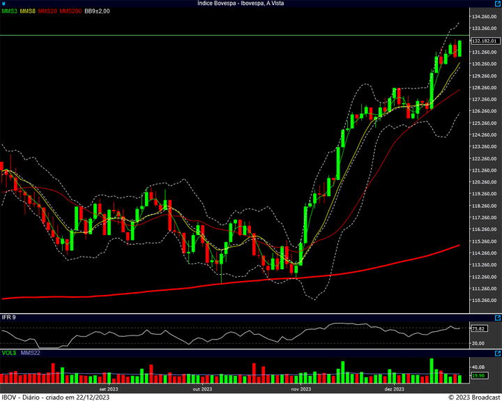 Neste momento, temos o nosso suporte na região dos 125.500 pontos. Enquanto a resistência, justamente nos atuais 133 mil pontos. (um dos objetivos do pivot de alta iniciado na pandemia)