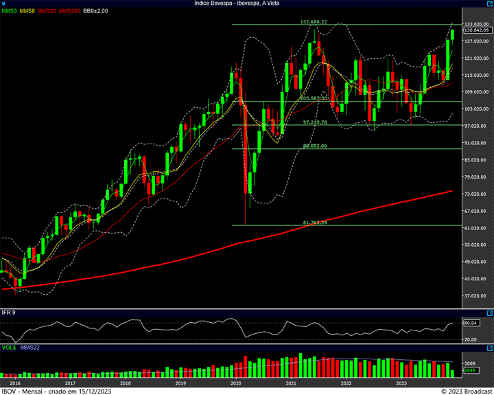 Temos sim ! Temos o alvo de um pivot lá de 2020, que por Fibonacci sugere uma área de interesse ali no 132.700 pontos. Ok, 133 mil para facilitar as coisas. 🙂
