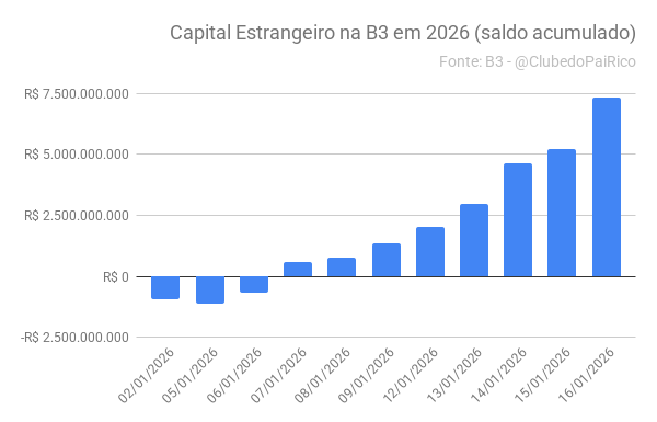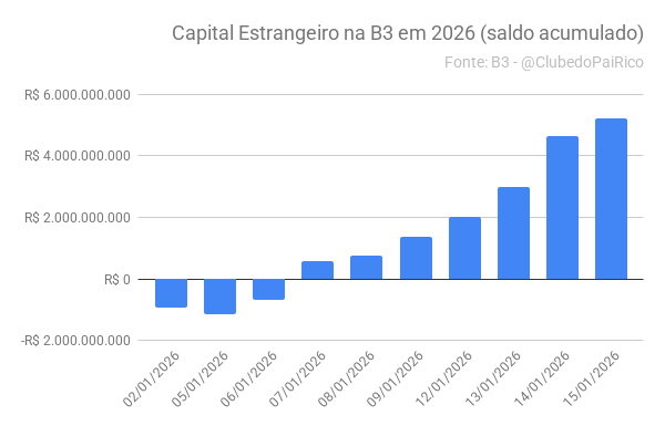 Gringos com muito apetite neste início de ano. Depois de apenas dois pregões de fuga, eles engataram a marcha e resolveram injetar dinheiro na B3. Quase R$5 bilhões até o dia 14 ! (sim, isso é forte)