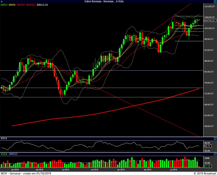 Neste momento, estamos no meio de uma briga: 103.900 é o suporte e 106 mil a resistência.