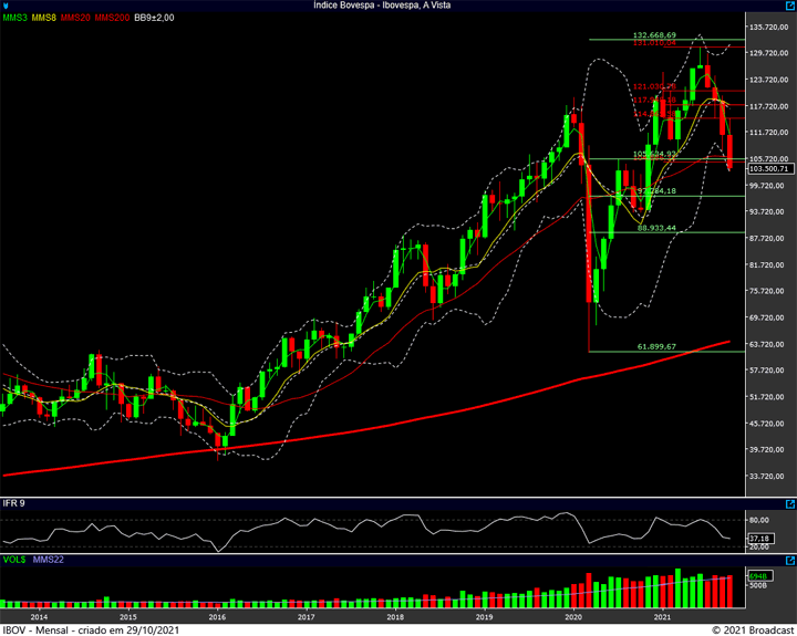 Já no mensal, estamos ainda em queda livre … Após a sinalização de possível correção no mês de junho, com uma shooting star, não temos sinal de que a coisa irá parar por enquanto …