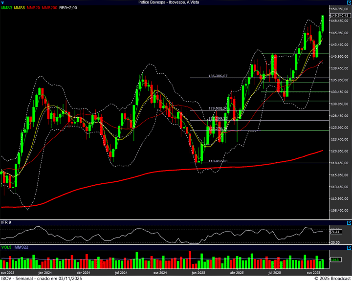 No gráfico semanal, a beleza de uma tendência de alta. De forma clara: topos e fundos mais altos do que os anteriores. Fundo em outubro de 2023. Topo no final de 2023. Fundo em junho de 2024. Topo em agosto de 2024. Fundo na virada de 2024 para 2025. Topo em junho de 2025. Fundo em julho de 2025. Topo em setembro de 2025. Fundo em outubro de 2025. Topo em …