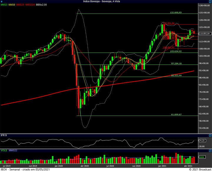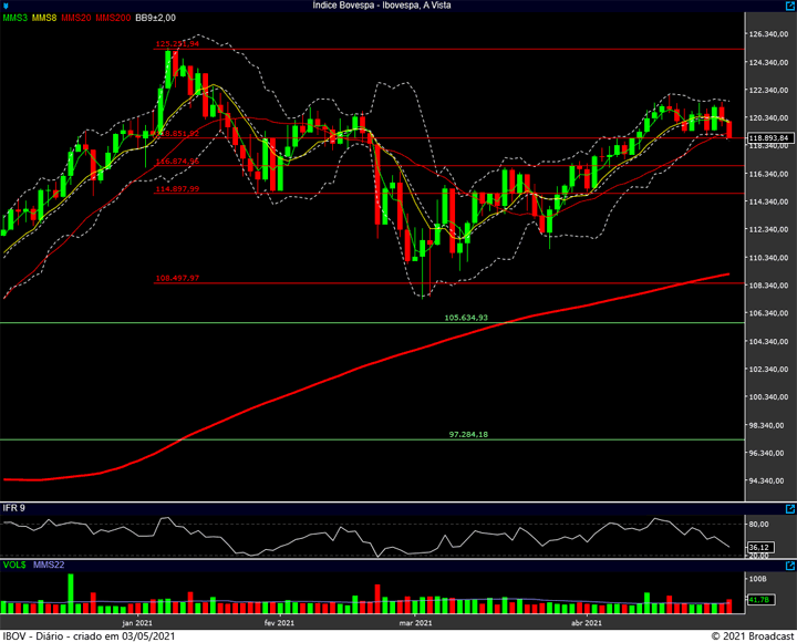 Neste momento a briga gira em torno dos 120k. É ele que vem “segurando” o índice. Com apoio do suporte nos 119k e a resistência dos 121k, o Ibovespa vem rondando a região dos 120 mil pontos já tem algum tempo. Estamos entrando no sell in may em um momento de decisão para o índice. 🙂