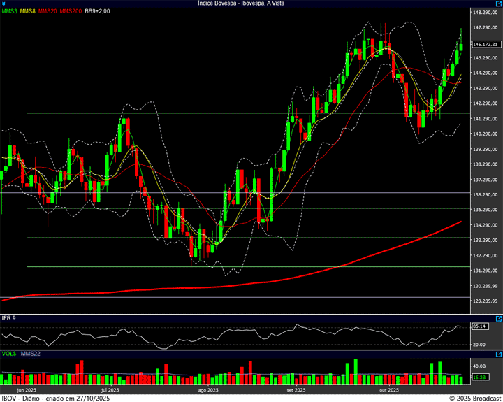 Portanto, para hoje, foco total em duas regiões: suporte no 145.700 pontos e resistência no 147.300 pontos.