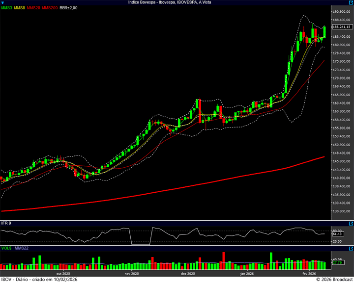 A resistência se encontra no 187.500 pontos. O suporte, no 180 mil.